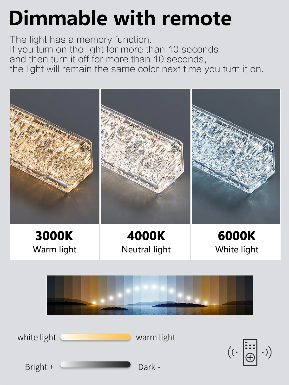 Color Tempeature: Warm White(2700K-3500K) No remote,Neutral light(4000K-4500K) No remote,Cool White(6000K-6500K) No remote,Dimmable with remote
